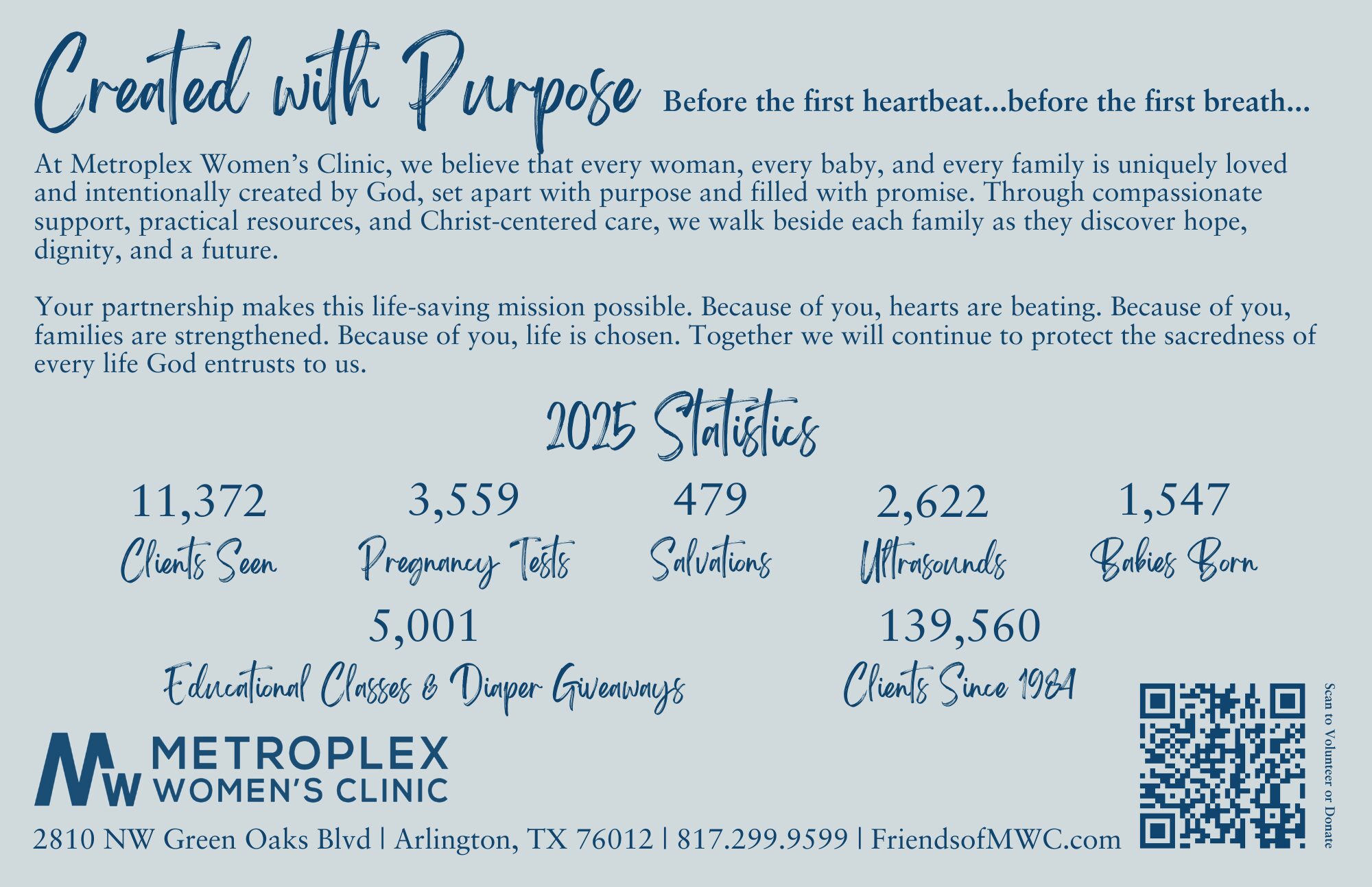 These fun campaigns help foster a culture of LIFE and raise support for Metroplex Women’s Clinic. They usually are conducted near the time of Sanctity of Life in January or between Mother’s Day & Father’s Day. This is a perfect activity to get your Church, Small Group, and Women’s Ministry more involved with MWC. Virtual option available too. Call 817.299.9599 to schedule or for more information.